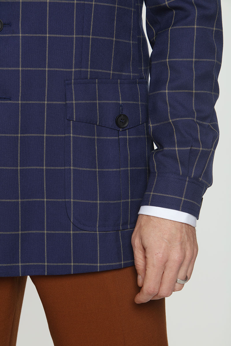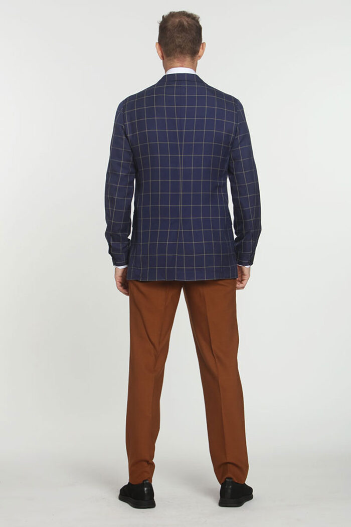 Cobalt box plaid shown with Umber Brown Trousers. One of our more fashion forward looks that will work well at a super luxury contemporary building for concierge or a trendy hotel.