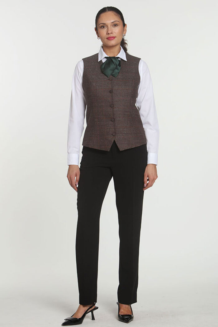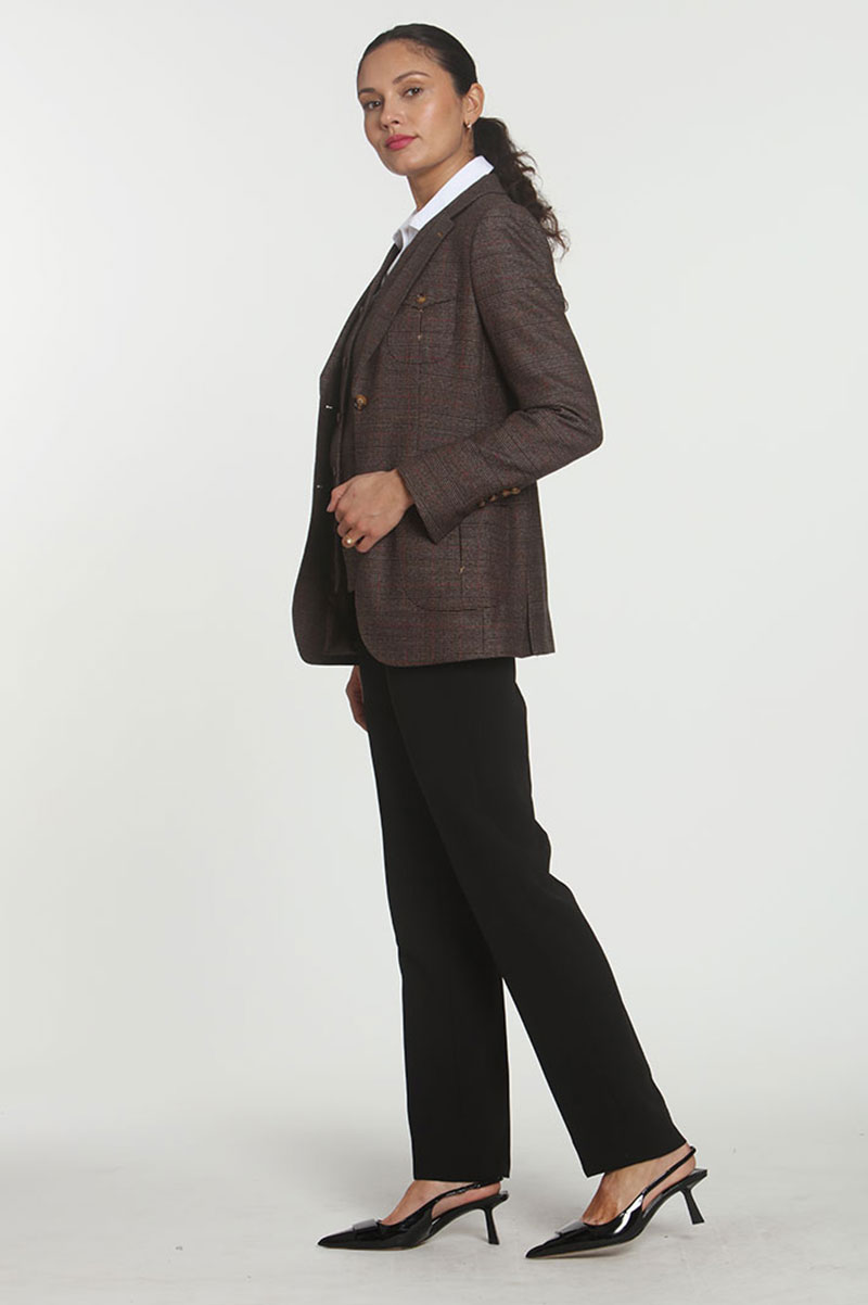 Brown plaid jacket, two lower patch pockets with triangle flap, and two upper patch pockets with triangle flap.