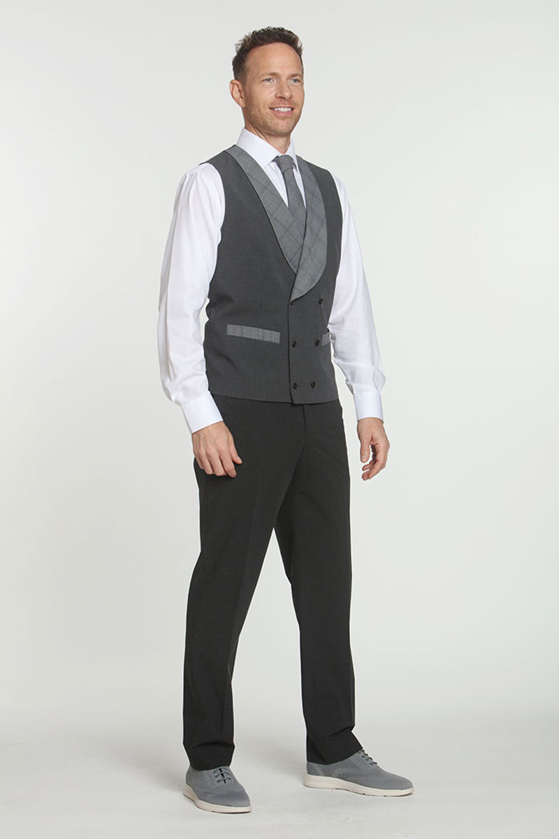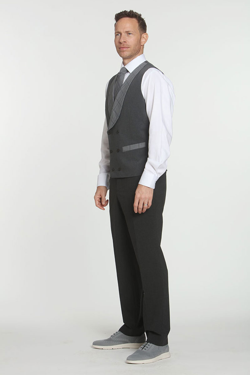 Double breasted medium grey vest with plaid shawl lapel and plaid pocket detail.