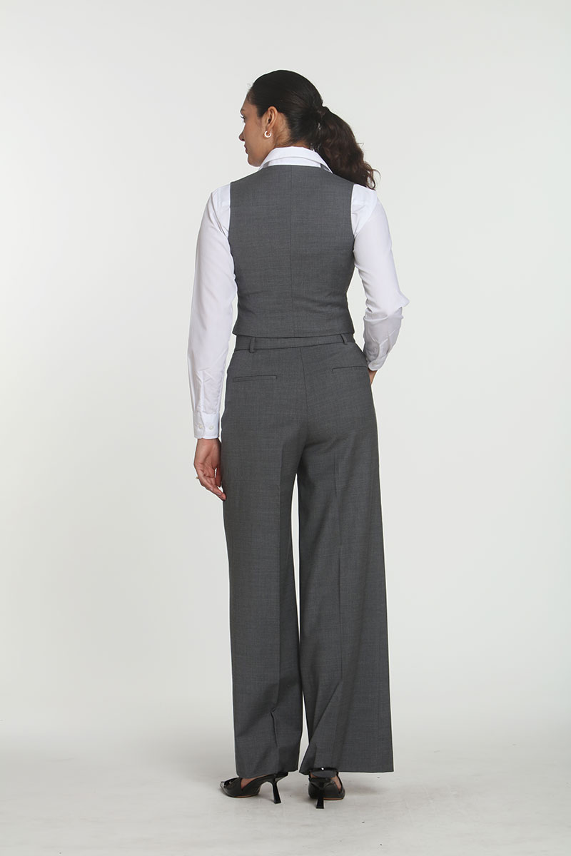 Grey 4 button vneck vest with coolat grey matching wide leg pant, and oversize belt made of the same fabric.