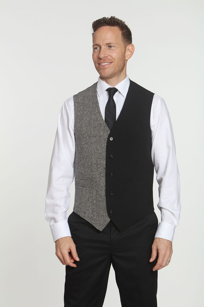 Half black and half houndstooth vest, 2 lower welt pockets, shown with black tailored trousers and black tie.