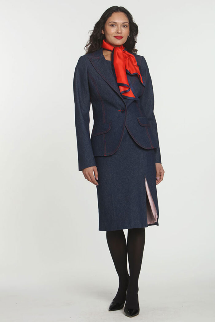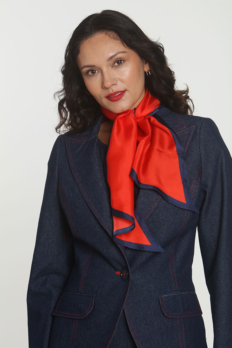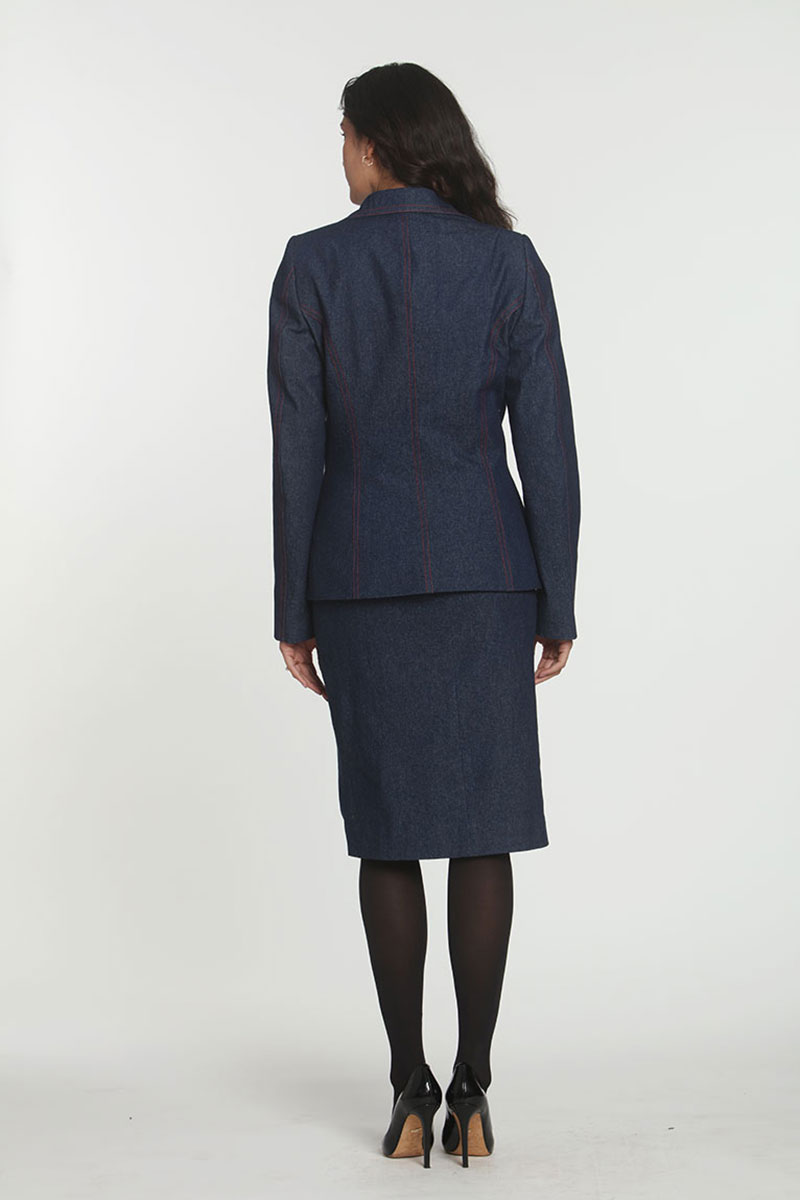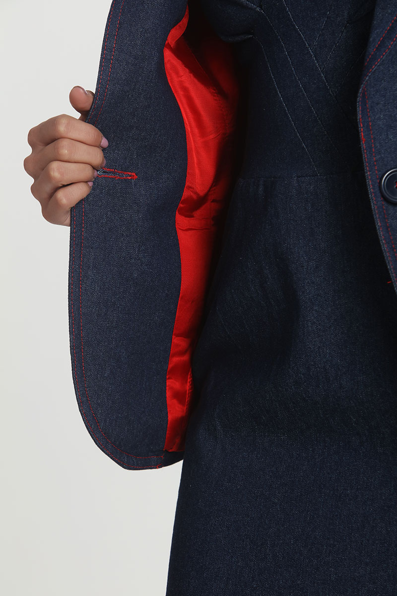 Medium Blue Denim One button blazer with contrasting red stitching on front and back seams, collar, and pockets, and red lining!