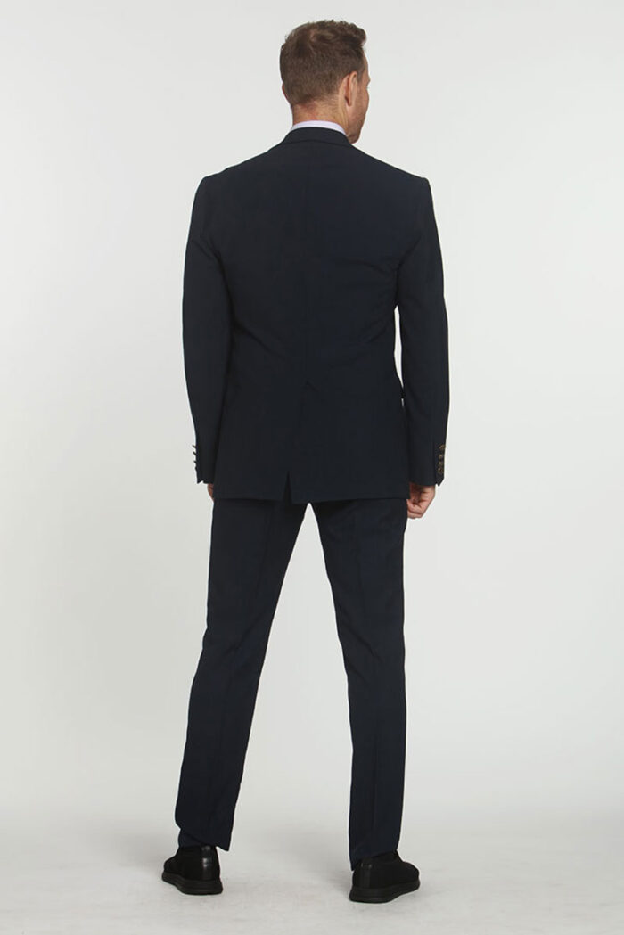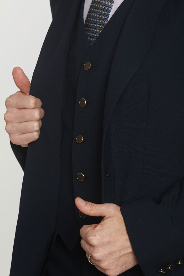 Navy wool jacket with a vest inlet attached to the actual jacket, so it has the look of a three piece while really being a single jacket.