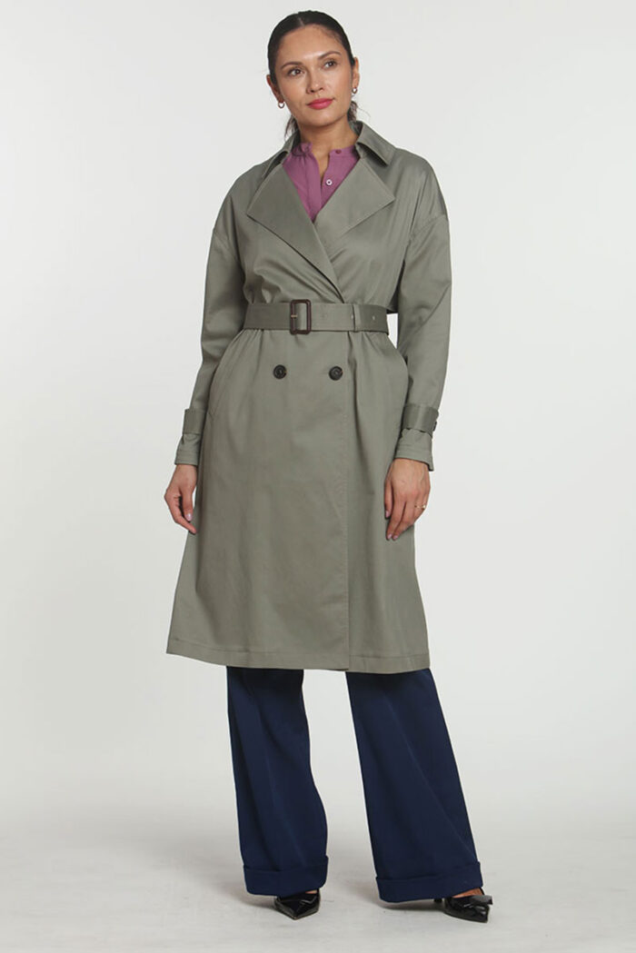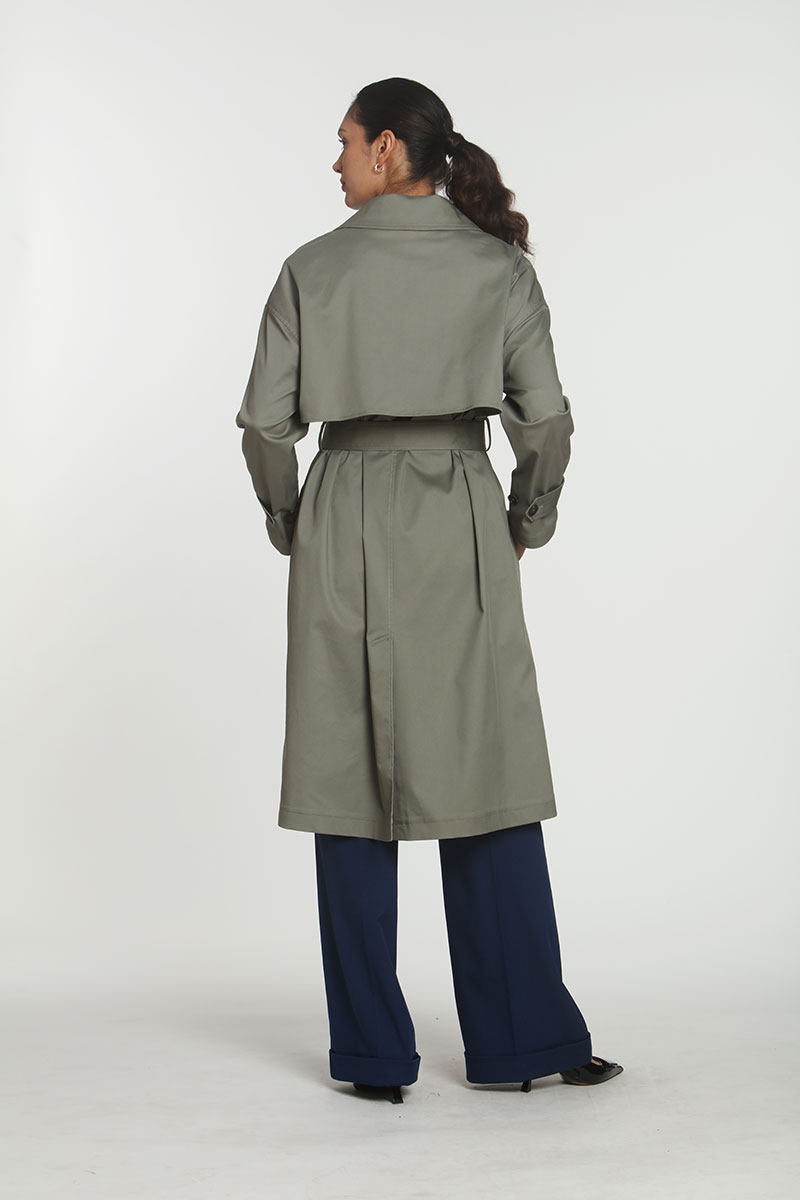 Water Resistant Olive Trench, with 4 button closure and matching belt. This is a Spring/Fall coat, perfect for your Hotel look!