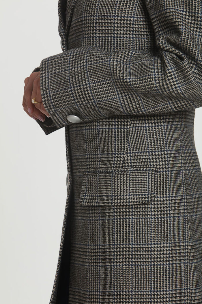 Female Model: Wearing 3 button plaid overcoat with three lower flap pockets, has a deep center vent in back. Stylish and warm, perfect for any hotel or building concierge/doorwoman.