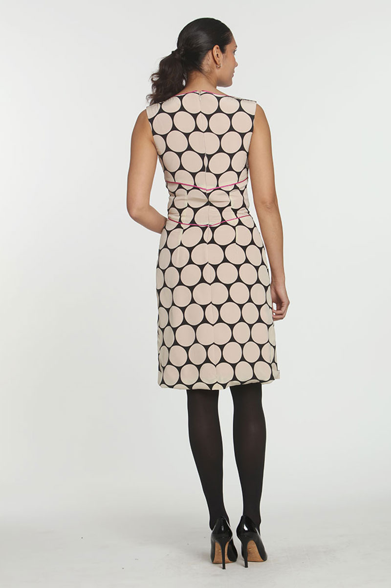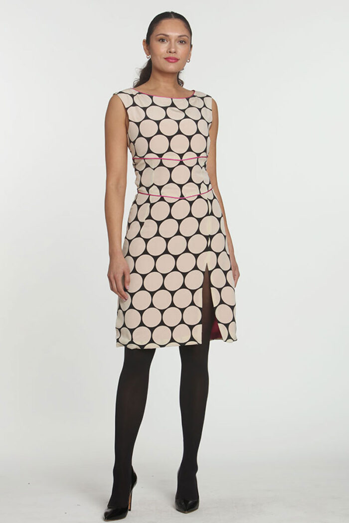 Silk polka dot sleeveless dress with hot pink piping to accentuate waist panel, just under the bustline, notice the off center slit.