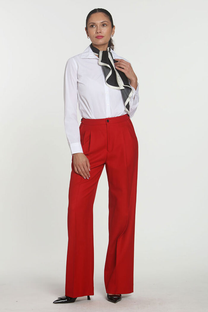 Double pleated red wool blend trouser, with adjustable waistband. Shown with white cotton blouse, and custom silk scarf (black with a white boarder).