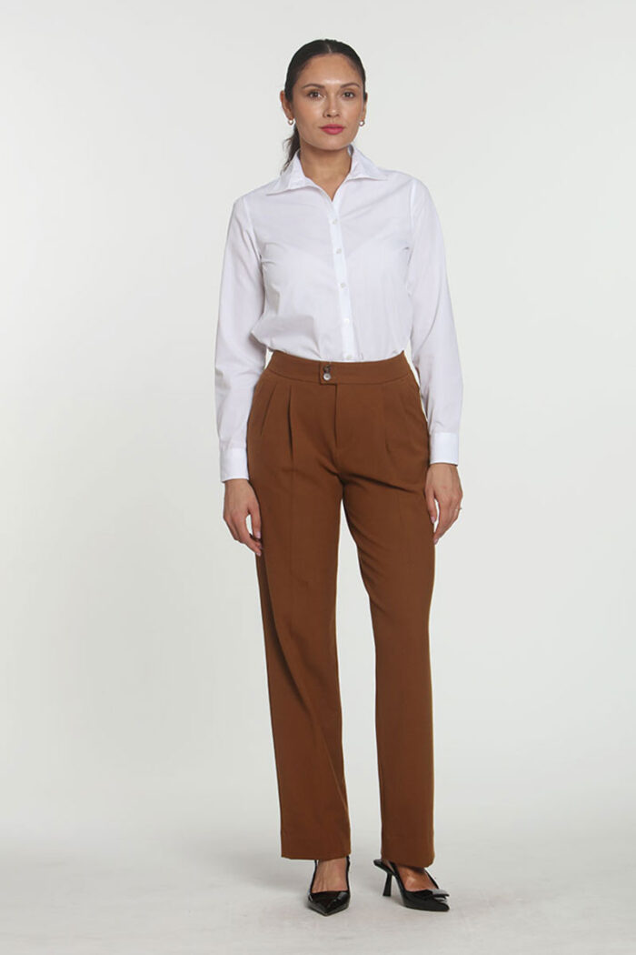 Umber Brown blended wool trouser with waist button just to the left of center, single pleat, and slight barrel leg cut. Can be worn with boots, loafers, or pumps!